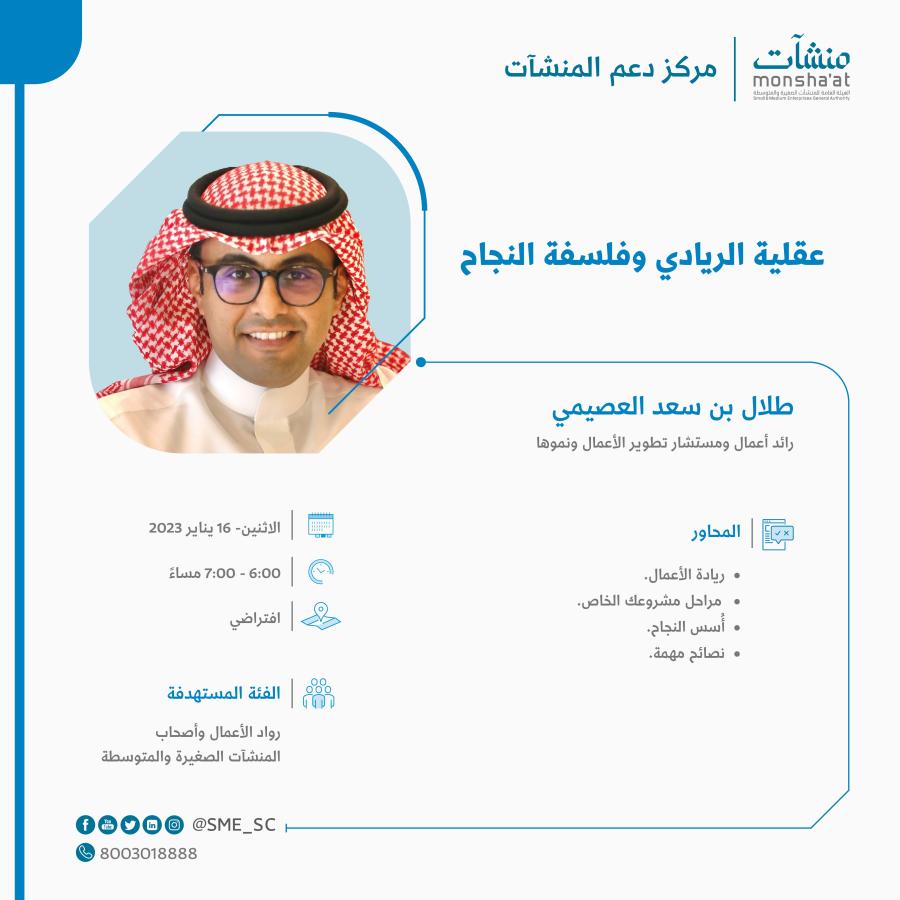 طلال بن سعد العصيمي "رائد أعمال ومستشار تطوير الأعمال ونموها" ؛ في لقاء افتراضي بعنوان "عقلية الريادي وفلسلة النجاح"