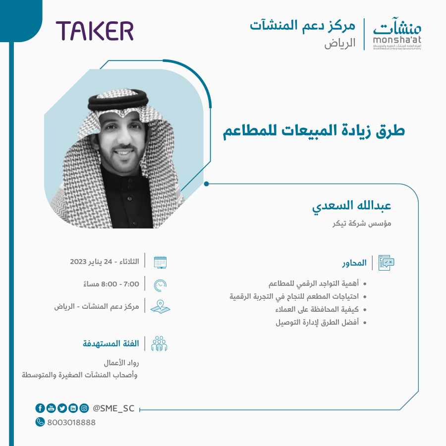 عبدالله السعدي "مؤسس شركة تيكر" ؛ في لقاء بعنوان "طرق زيادة المبيعات للمطاعم "