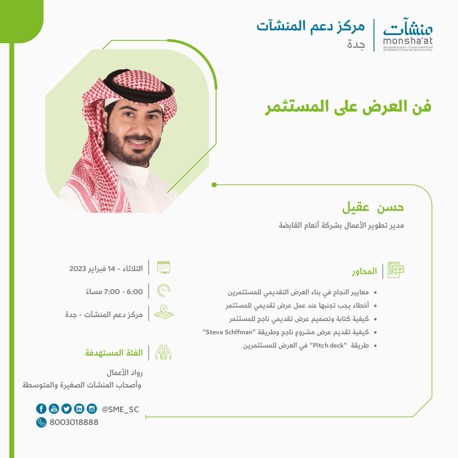 حسن عقيل "مدير تطوير الأعمال بشركة أنعام القابضة" ؛ في لقاء بعنوان "فن العرض على المستثمر"