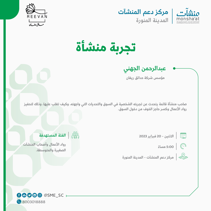 عبدالرحمن الجهني "مؤسس شركة حدائق ريفان" ؛ في لقاء بعنوان "تجربة منشأة"