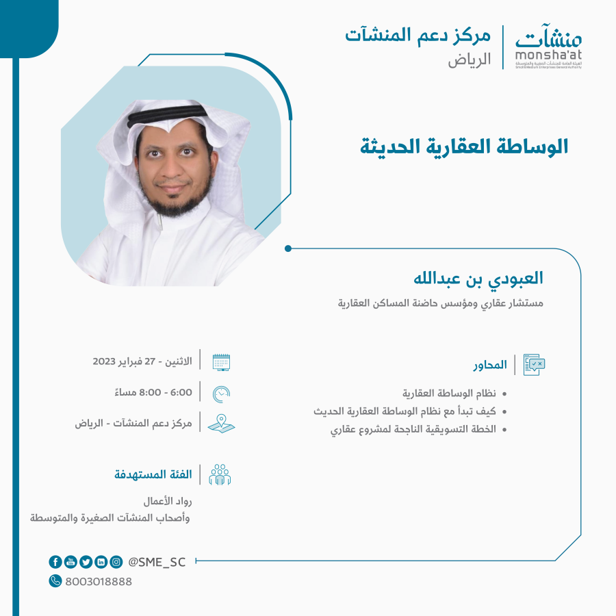 العبودي بن عبدالله "مستشار عقاري ومؤسس حاضنة المساكن العقارية" ؛ في لقاء بعنوان "الوساطة العقارية الحديثة"