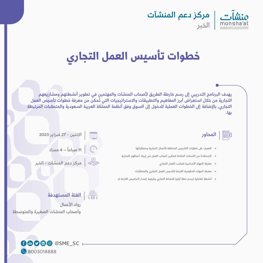 برنامج تدريبي يهدف إلى رسم خارطة الطريق لأصحاب المنشآت والمهتمين في تطوير أنشطتهم ومشاريعهم التجارية.