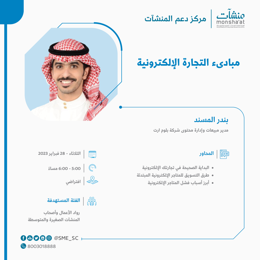 بندر المسند "مدير مبيعات وإدارة محتوى شركة بلوم ارت" ؛ في لقاء بعنوان "مبادئ التجارة الإلكترونية"