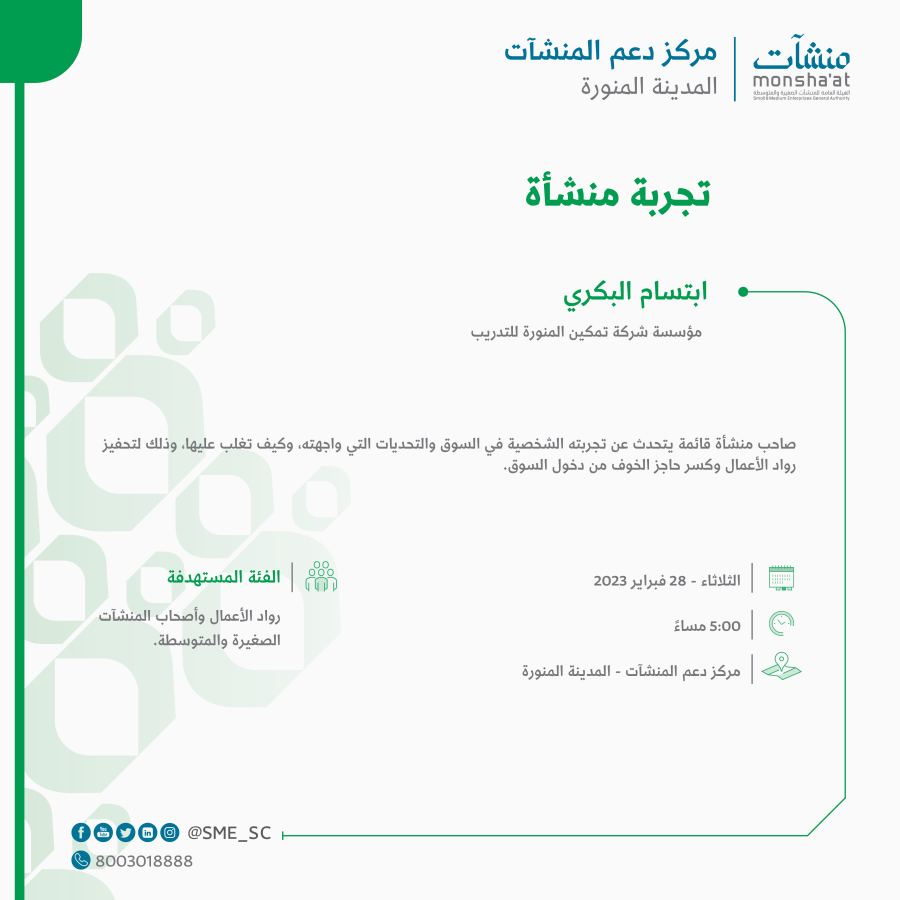أبتسام البكري "مؤسسة شركة تمكين المنورة للتدريب" ؛ في لقاء بعنوان "تجربة منشأة"