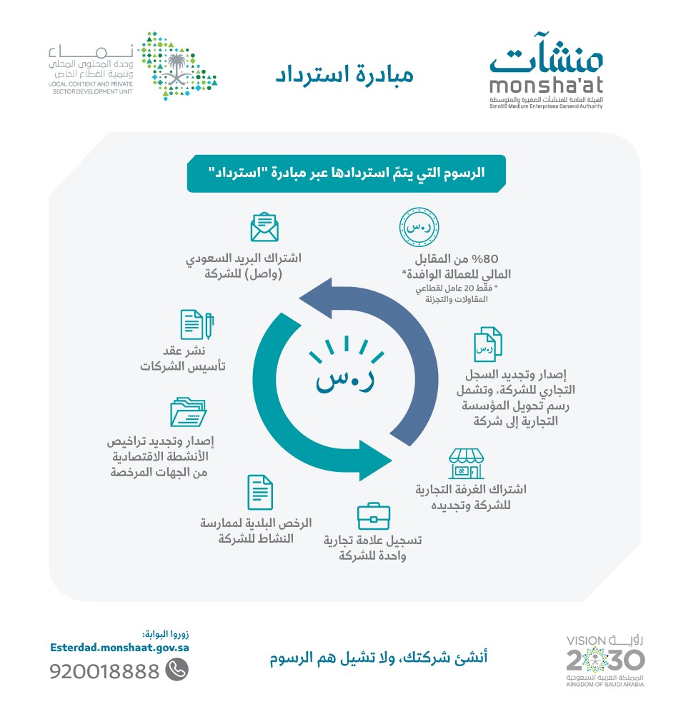 الجدير بالذكر أن مبادرة "استرداد" أُطلقت في بداية عام 2018 دعمًا للمنشآت الجديدة والناشئة وتمكينًا لها وتخفيفًا على الأعباء والالتزامات المترتبة عليها.