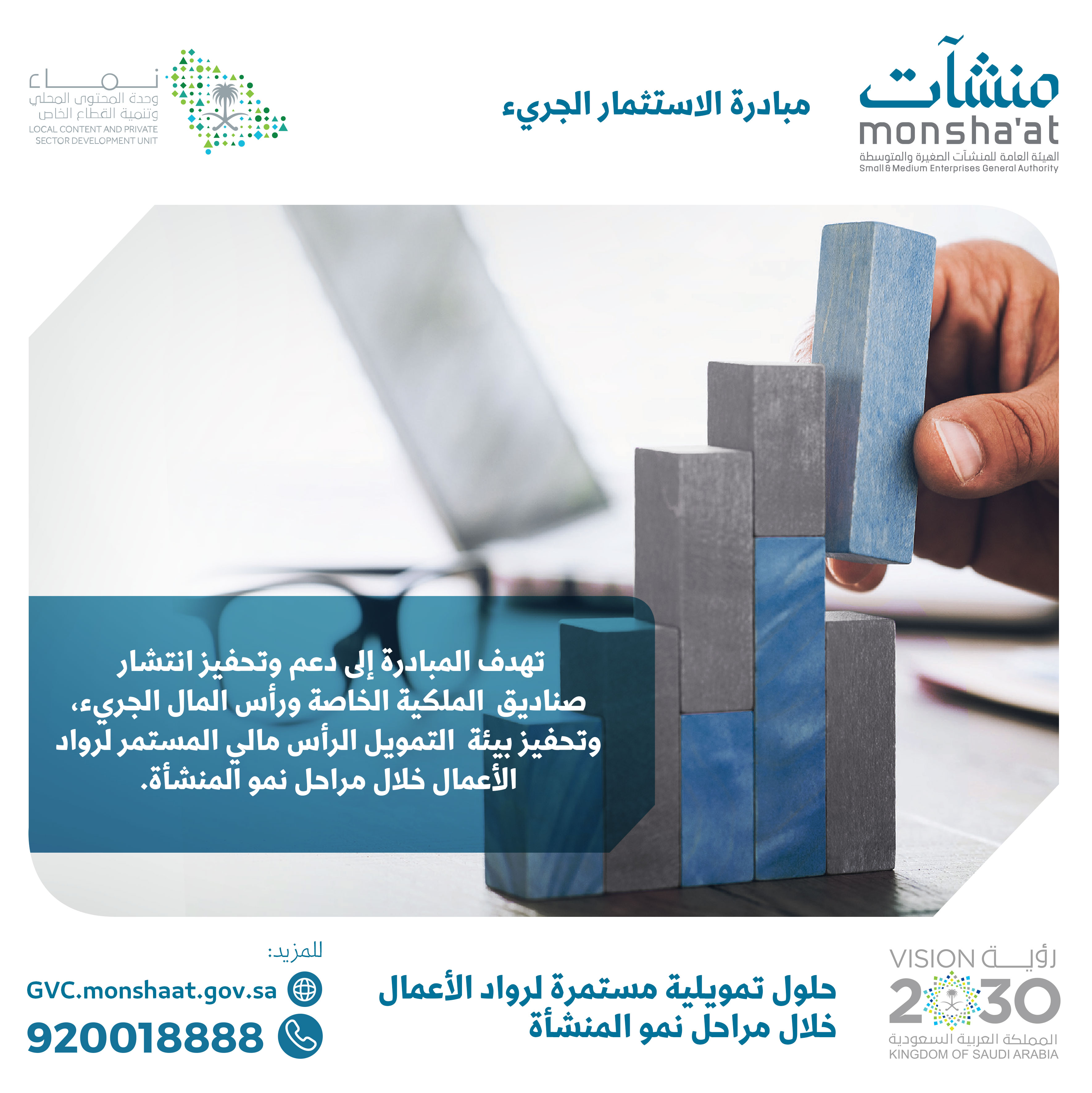 أطلقت الهيئة العامة للمنشآت الصغيرة والمتوسطة "منشآت" ووحدة المحتوى المحلي وتنمية القطاع الخاص "نماء" ضمن خطة تحفيز القطاع الخاص، مبادرة الاستثمار الجريء للمنشآت الصغيرة والمتوسطة برأس مال 2.8 مليار ريال.