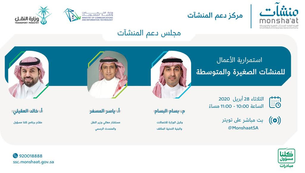 بحضور كل من وزارة الاتصالات وتقنية المعلومات ووزارة النقل من خلال نقل مباشر على حساب "منشآت" @MonshaatSA في منصة تويتر الساعة العاشرة مساء.