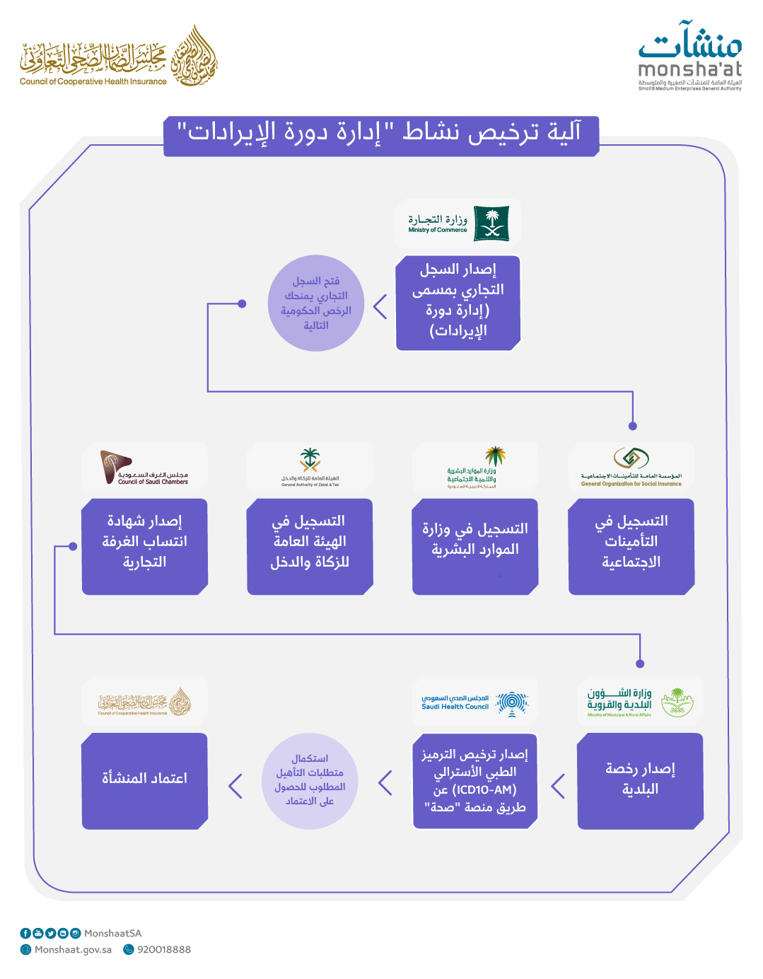 وتبدأ عملية ترخيص نشاط إدارة دورة الإيرادات بإصدار السجل التجاري من وزارة التجارة بنشاط "إدارة دورة الإيرادات"، ثم التسجيل بوزارة الموارد البشرية والتأمينات الاجتماعية، وإصدار شهادة الزكاة وشهادة انتساب الغرفة التجارية، ورخصة البلدية، يلي ذلك الحصول على ترخيص الترميز الطبي الأسترالي (ICD10 - AM) من المجلس الصحي السعودي عن طريق منصة "صحة" ، وصولًا إلى اعتماد المنشأة من قبل مجلس الضمان الصحي التعاوني، ولمعرفة متطلبات تأهيل شركات إدارة دورة الإرادات للحصول على الاعتماد زيارة الرابط التالي: