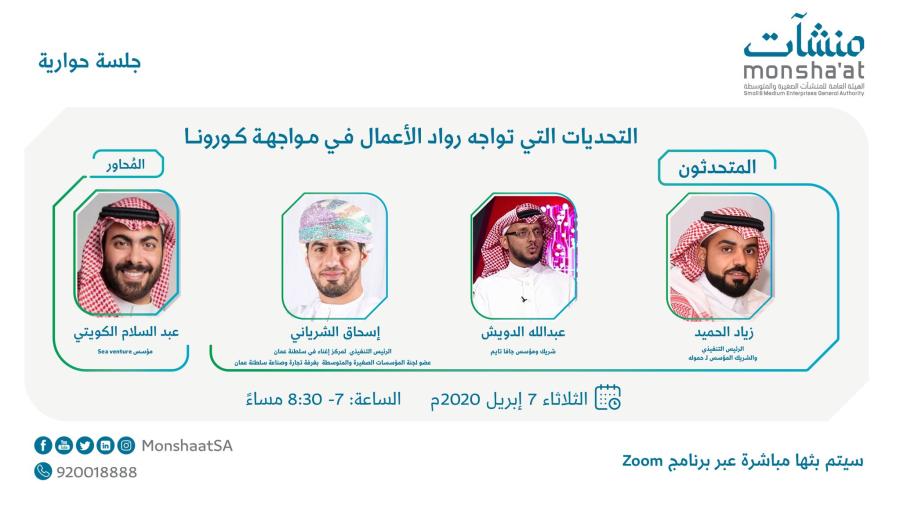 لروّاد ورائدات الأعمال؛ تعرفوا على التحديات التي تواجهكم خلال أزمة كورونا ضمن جلسة حوارية يشارك بها نخبة من روّاد الأعمال.